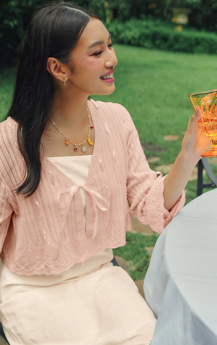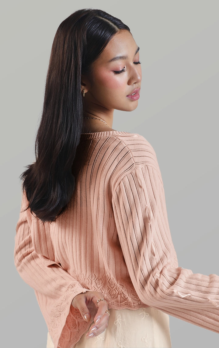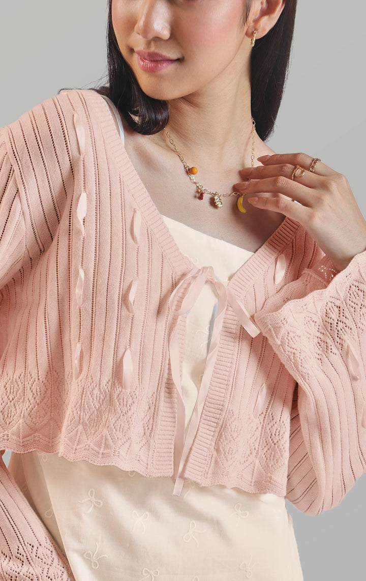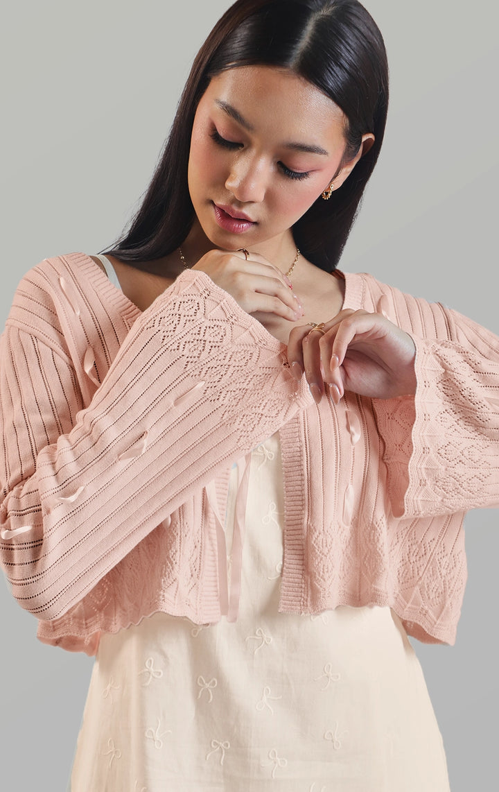 POINTELLE KNIT BOXY CARDIGAN WITH SCALLOP HEM AND INSERT RIBBON DETAIL