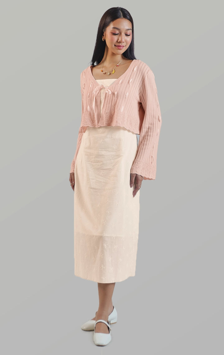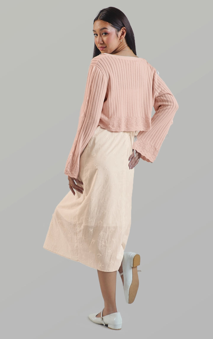 The Pointelle Knit Boxy Cardigan with Scallop Hem and Insert Ribbon Detail in beige is the ultimate layering piece for your wardrobe. Its scallop hem and ribbon insert elevate the cozy pointelle knit, while the cropped, boxy cut and kimono sleeves give it a modern, effortless charm.