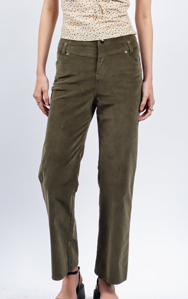 CORDUROY STRAIGHT LEG PANTS WITH FRONT YOKE AND RAW HEM