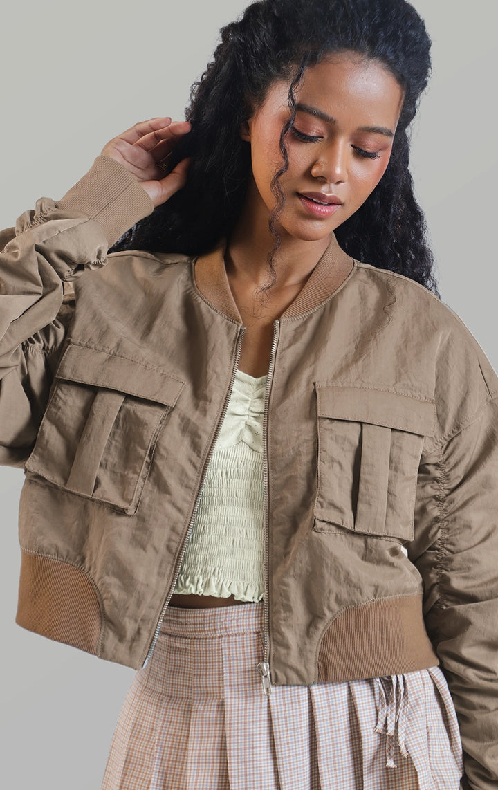 Make every street a runway with the Poly nylon Cropped Bomber Jacket in khaki. Designed with chic ruching, a high neckline, and a cropped silhouette, it’s your new go-to for layering with edge.