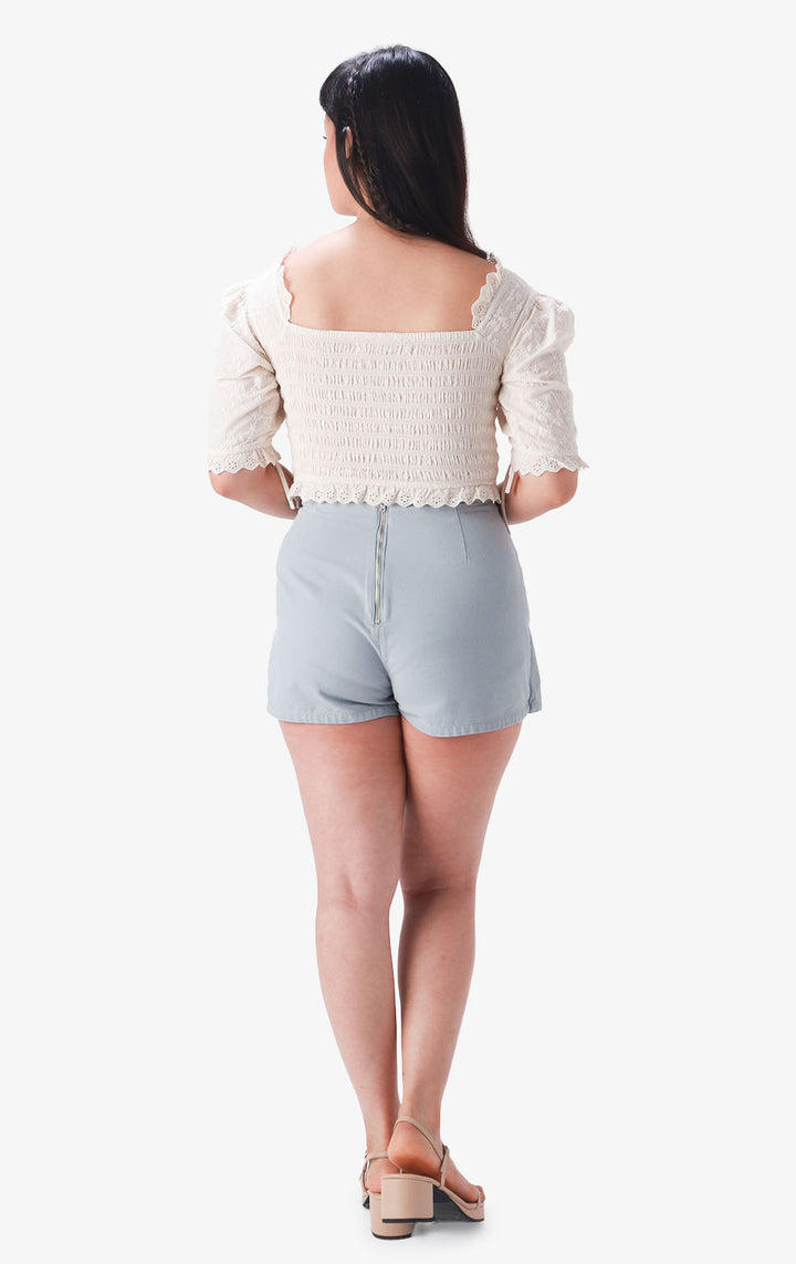 EYELET RUCHED TOP WITH LACE TRIMS