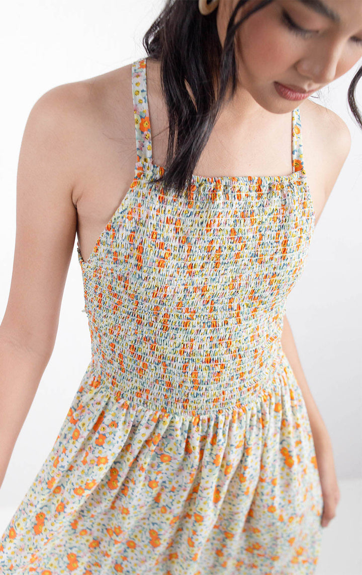 FLORAL SMOCKED CRISS CROSS BACK DRESS