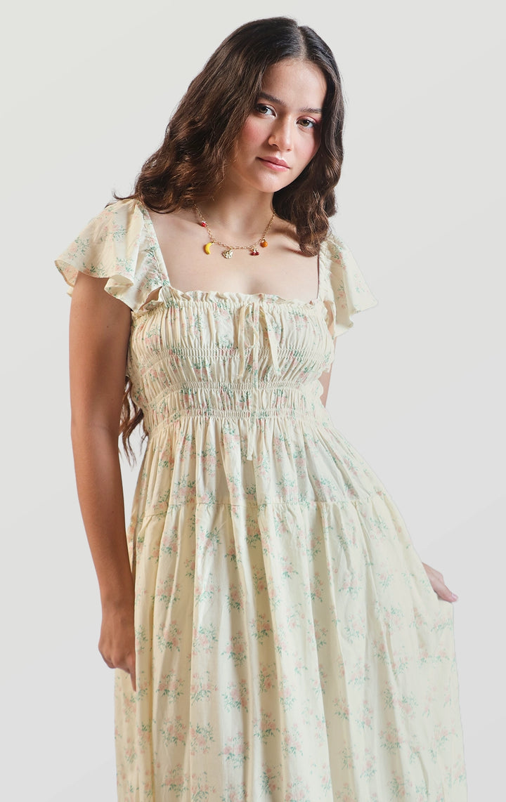 FLORAL SMOCKED MAXI DRESS WITH FLUTTER SLEEVES
