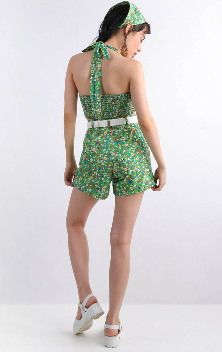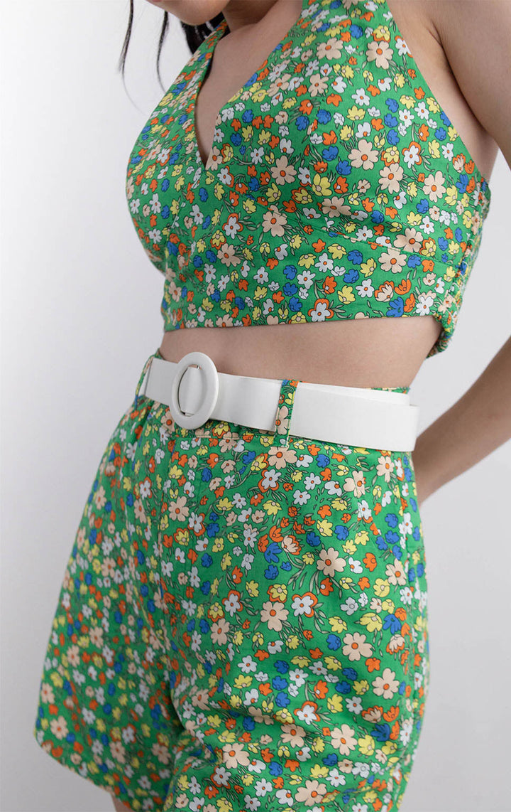 GROOVY FLOWERS HALTER TOP SHORTS SET W/ DETACHABLE BELT