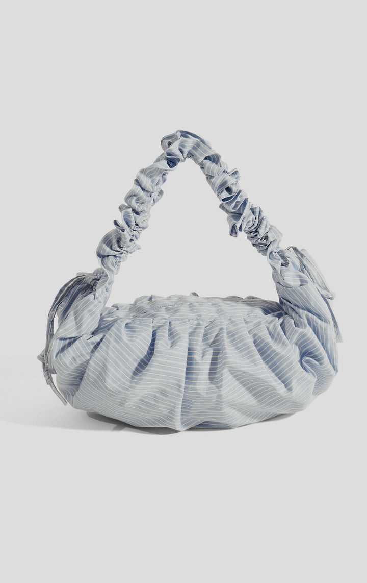 The Nylon Stripes Dumpling Shoulder Bag in blue features a ruched handle and soft puffer silhouette—crafted for lightweight comfort and effortless chic appeal.
