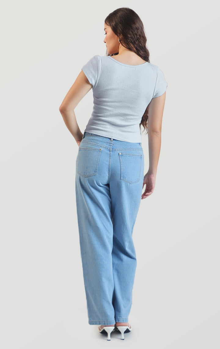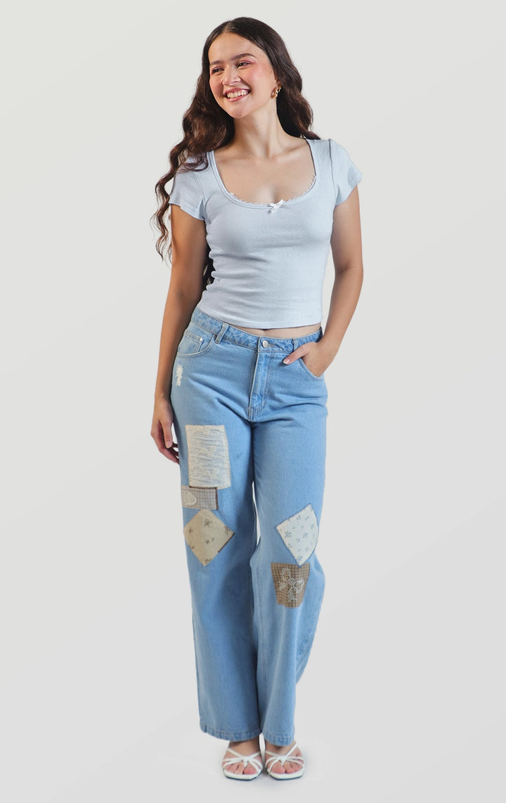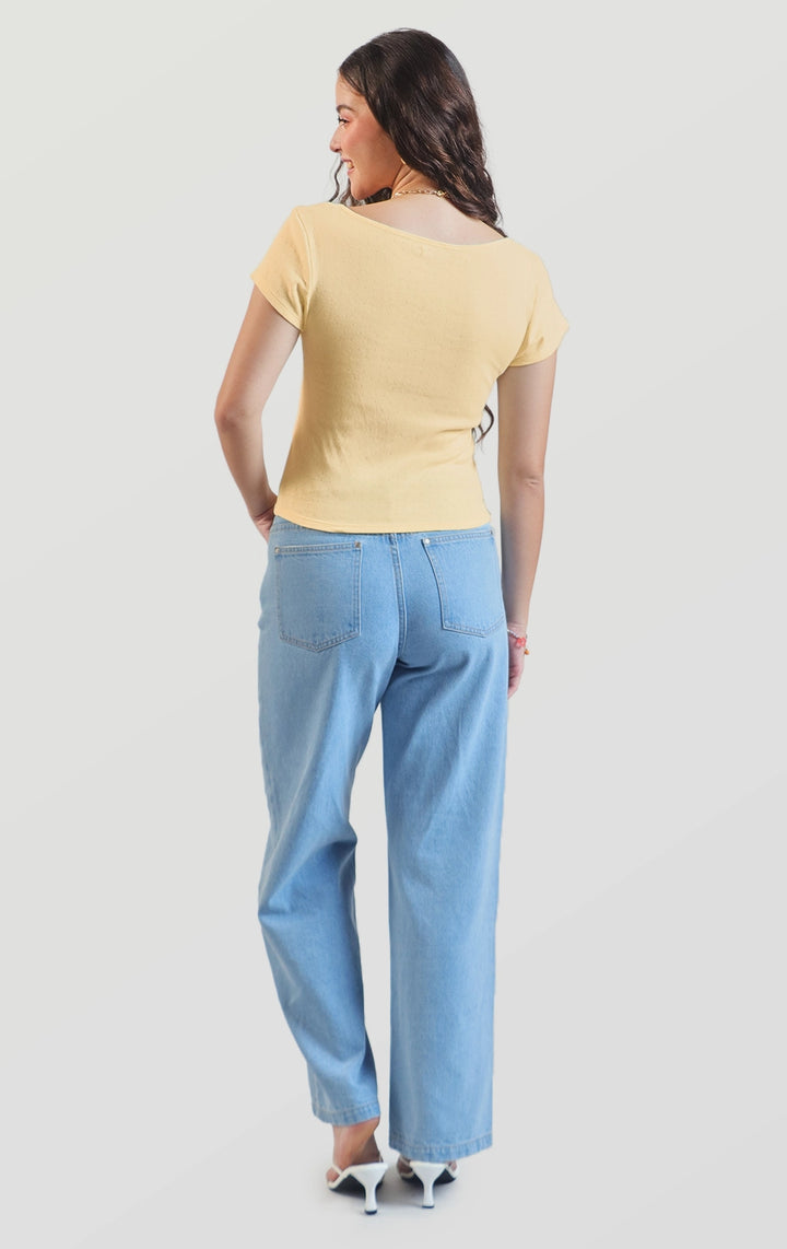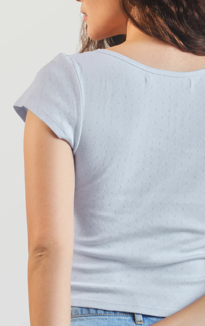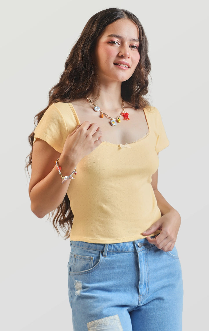 Refresh your basics with this Pointelle Jersey Baby Tee with Lace and Bow Details that comes in blue and yellow. Pair it with jeans, skirts, or shorts for an instant feminine touch.