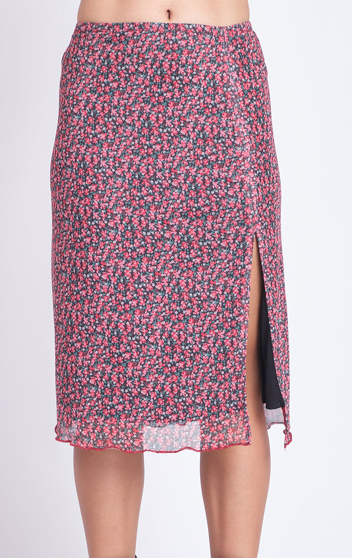 ROMANTIC FLORAL MESH MIDI SKIRT WITH SLIT