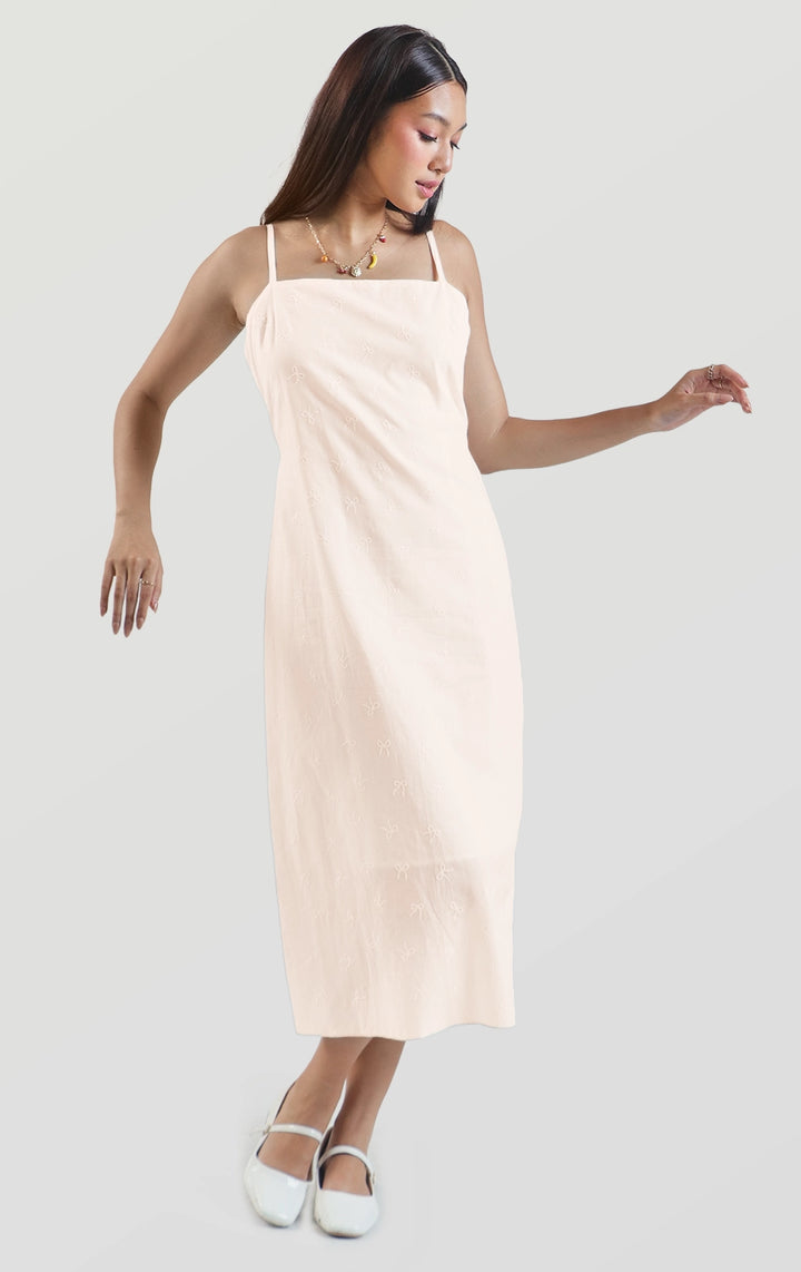 This off white Bow Embroidery Slip Midi Dress is crafted from embroidered Swiss cotton with dainty bow motifs. Designed with slim straps, a square neckline, and a breezy midi length, it offers effortless elegance for warm-weather occasions.