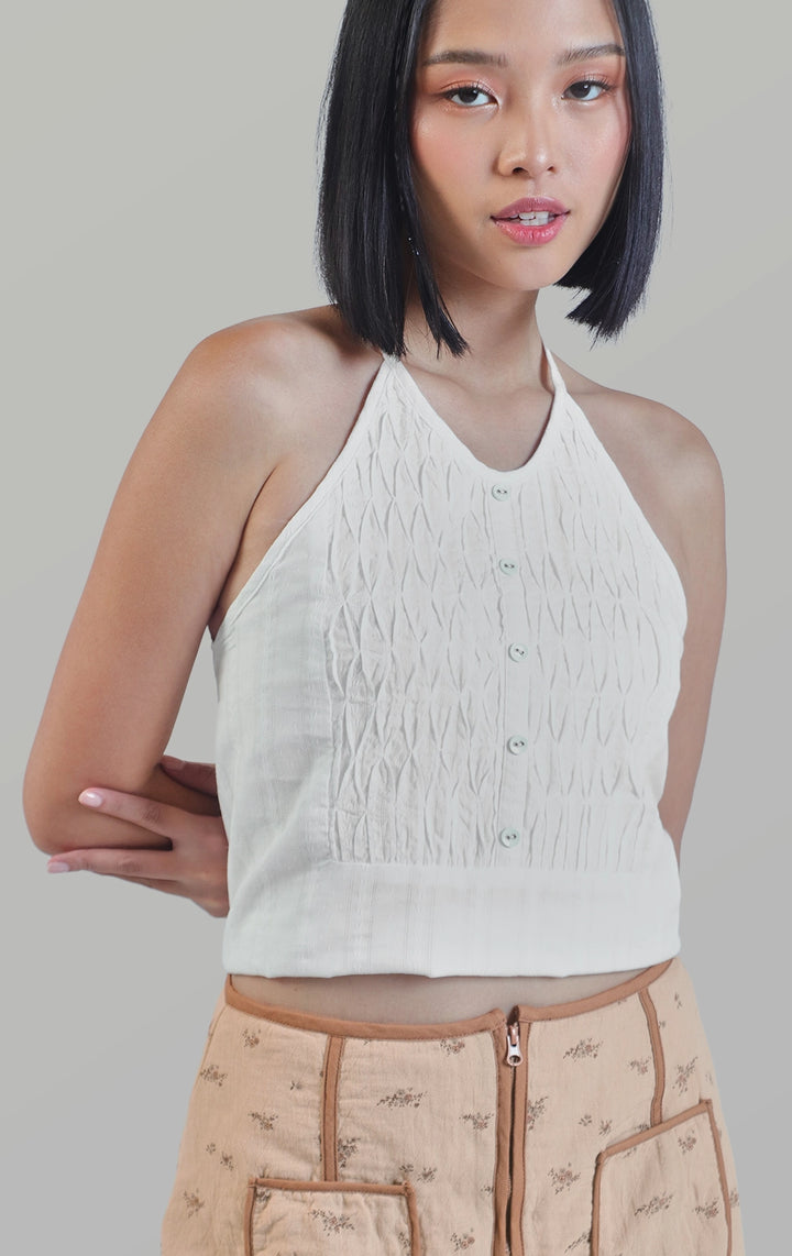 TEXTURED DOBBY DIAMOND SMOCKING TUXEDO-LIKE HALTER TOP