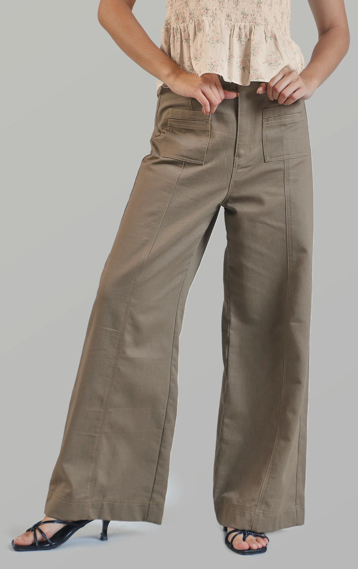 TWILL HIGHWAISTED WIDE LEG PANTS WITH CUT AND SEW AND PATCH POCKET DETAIL